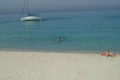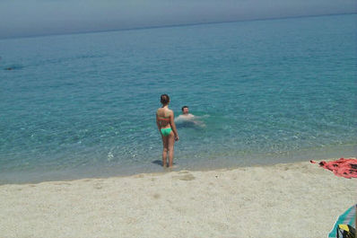 Pot smo nameravali končati v kraju Tropea, kjer naj bi bil nek zelo lep "štelplac". V Tropea smo prišli pozno zvečer in tega "štelplaca" nismo našli. Po Tropeji smo se vozili po kozjih stezicah in tako zašli na plažo pod gradom, ki je bil modro osvetljen - izgledalo je kot v pravljici. Na žalost pa fotoaparat "ni znal narediti" dober posnetek. Pod tem gradom je podnevi plaža izgledala takole.