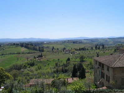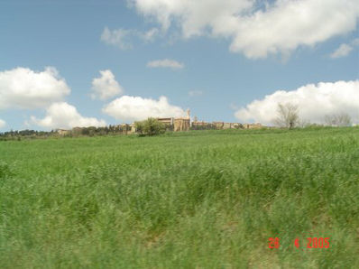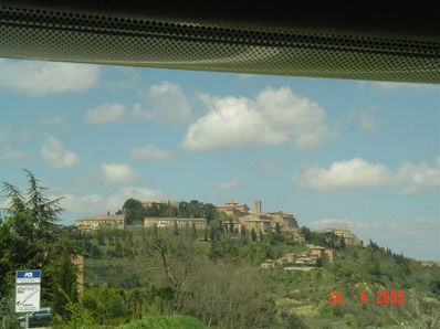 Ker smo bili z Zvržinčki in Dolenci dogovorjeni za večerni zbor v San Gimignanu in se nismo hoteli voziti po avtocesti, smo se po podeželju mimo slikovitih vasic, posejanih po kopastih vrhovih pokrajine in mimo neštetih kmetij na nizkih gričih skozi Chianciano Terme, Montepulciano, Pienzo pripeljali na magistralko Siena-Viterbo.