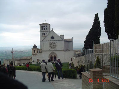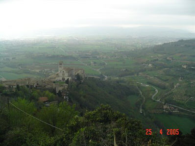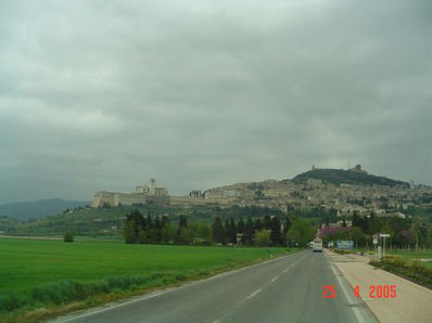 Usmerjevalne table za Assisi so začuda stalno prisotne ob avtocesti mimo Perugie, torej kar kmalu zagledamo v daljavi na vzpetini levo od avtoceste naš cilj.