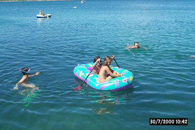 Naši malki pa je bilo povsem "ravno" kaj je vodoravno in kaj ne. Pa tudi obala ji je bila po godu. Končno ena kjer ni veliiiikih valov. Tokrat je niti zvečer nismo mogli zvabiti iz vode. Ko pa je dobila še prijateljice sva jo videla le še med "rednimi servisi" .....