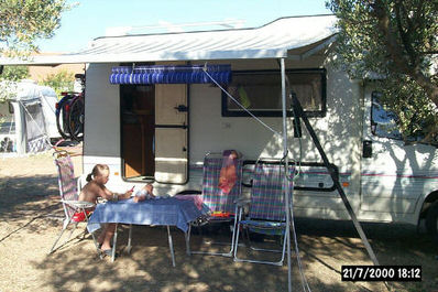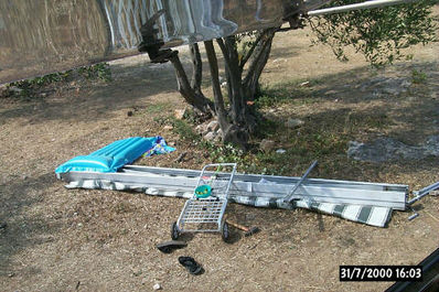 Ponoči na soboto smo doživeli vihar, kakršnega domačini ne pomnijo (tudi mi ne). Tenda z gornje slike je tako teden dni po prihodu v Pirovac doživela žalosten konec. Odtrgalo jo je kot za šalo, prevrnilo nekaj prikolic in dreves, da o baldahinih in šotorih ne govorim.