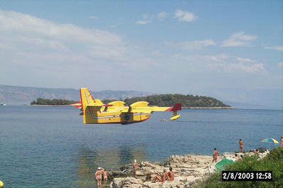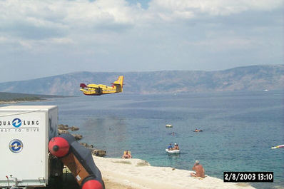 Postavili smo se na sicer eksluziven prostor "direkt am meer". Predvsem ni bilo okrog dreves, ki bi znala pasti ali pa goreti. "Ziher je ziher". In takoj prvo jutro nas je prebudil strašen ropot. Sploh nisem vedel kaj se dogaja. Seveda je šlo za zadnje čase že kar turistično znamenitost Hvara. Mislim, da komentar n potreben. Eden od pilotov je bil zabavnejše sorte in nam je letal narovnost nad glavami. Narod pa je (smo) tekali s kamerami in aparati po kampu .... in ni nam bilo dolgčas. Enkrat z leve in drugič z desne. No tretji dan je bilo zabave konec. Ogenj so očitno uspeli pogasiti.