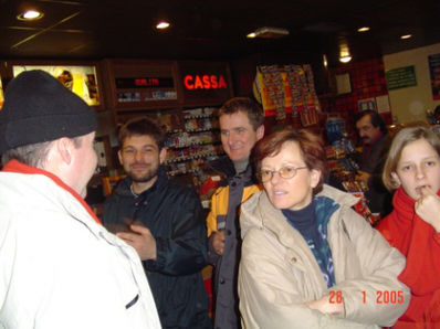 Razen praznovanj rojstnih dni, novoletnega potepanja je bilo smučanje v Piancavallu prvi pravi zimski, sneženi vikend - 28. do 30. januar 05). Seveda smo šli v konvoju - drugače ne znamo več. In nam je všeč. Zbor je bil ob 18. uri na Feretičih. Seveda smo samo mi zamudili. Malo ker sta ženski "mutili" in malo, ker je Igor pozabil jeklenko doma in smo zato mimogrede še v plinarno po novo zavili. Bili so že rahlo nervozni. Vročine ni bilo nobene in stati zunaj......niti borovničk se nisem lotil, da mi v grlu ne zmrznejo. Po uri vožnje smo spet stali. Gambler se je tresel, ker mu je padla koncetracija kofeina. Ampak je "zrihtu" tko poceni karte, da naj mu bo.